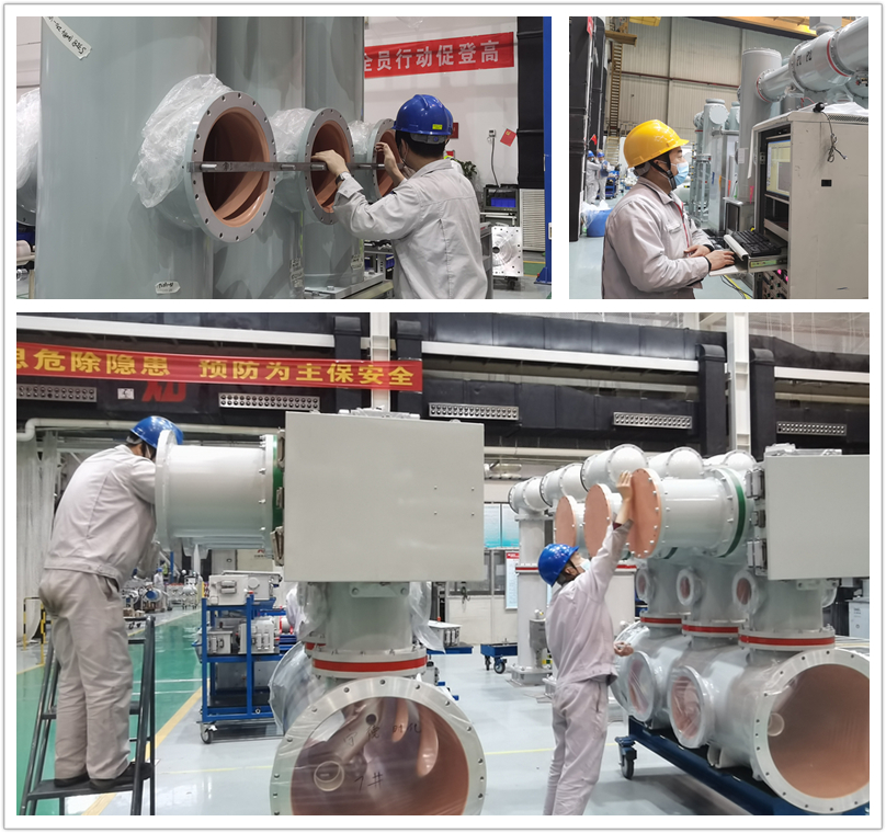 国网陕西宝鸡千河330kV输变电工程20个间隔的ZHW4-126产品是断路器产品线目前出产交期最集中、台数量最大的,产品线紧密联系制造中心协调出产工作,并及时选派采购人员前往山东和西安周边厂家沟通壳体成套供应事项,计划、采购人员积极拉动成套工作,一线操作员工以时不我待的紧迫感严格按照工艺技术要求开展装配,力争工程高质量按期履约。同时,车间其他常规型号产品、内配组件断路器、套管、母线等装配出产工作正有条不紊的进行中。